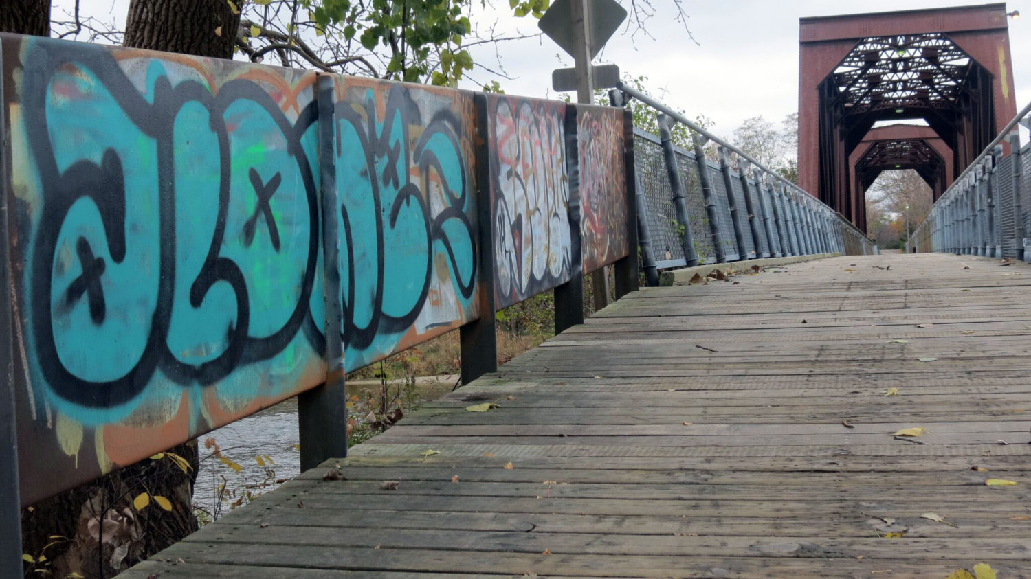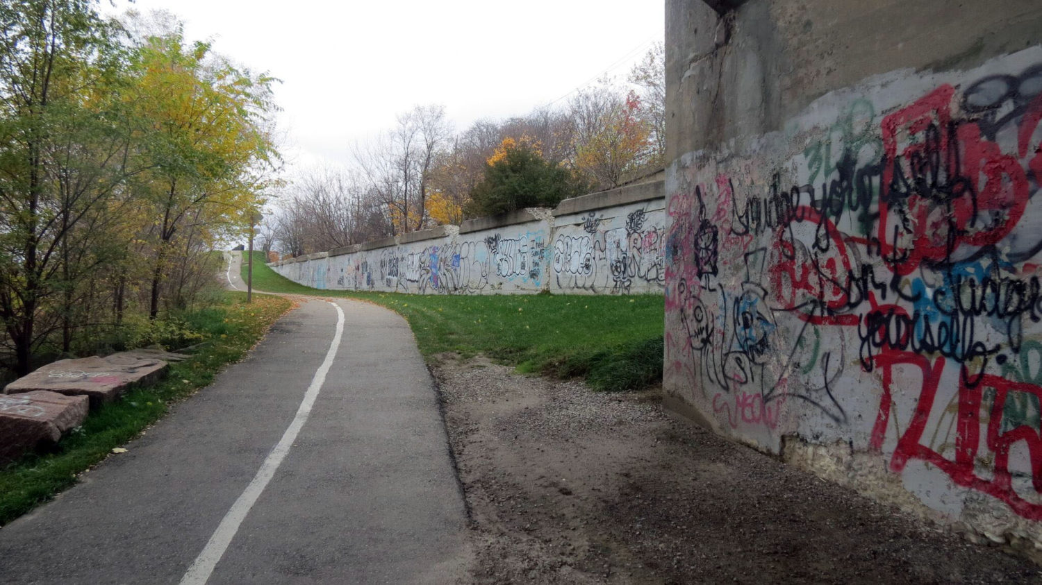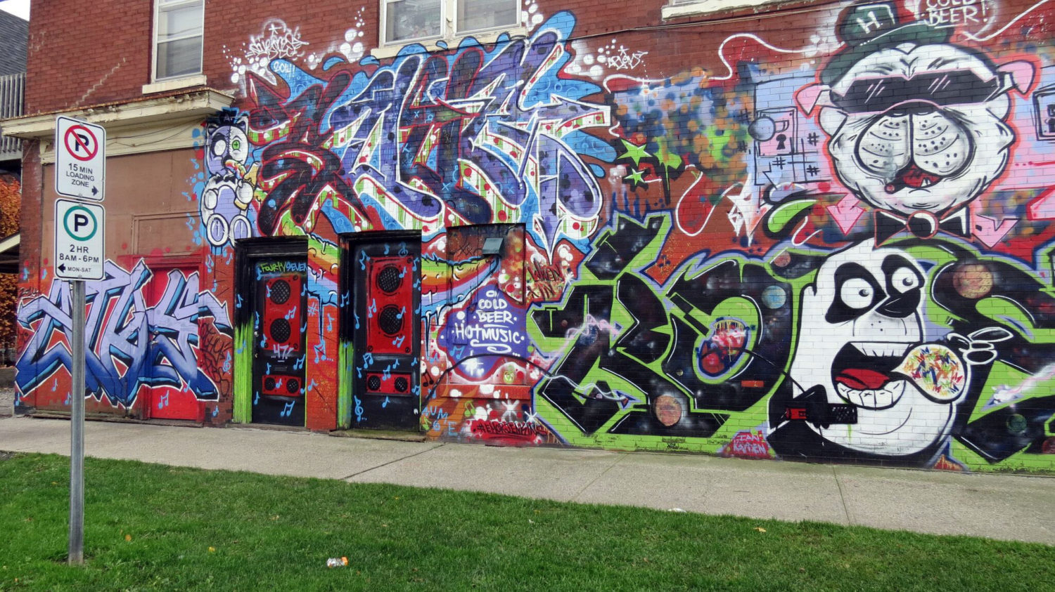 Two Doors Down, a local bar located at 139 Market St. has one of the most iconic pieces in the downtown core exhibiting a panda, musical notes, speakers and many more pieces. A newly added piece is located on Dalhousie across from RCW. Another location that is filled with many pieces is the Grand River Trail. This scenic trail does not only hold itself with the beautiful scenery of the Grand River and abundance of nature surrounding it, but there are many pieces of graffiti in and around the trail. The fusion of human-made beauty and nature create a balance that accentuates the dependence we have on each other.